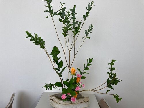 今日の枝物は「フランス柳」と聞いて、フランスにも柳があるんだと思った。 調べてみるとかごを編むのによく使われているようだ。 (へぇー、知らないことばかりだ) 今は先の方に葉が付いているけれど、もうすぐ葉が落ちるとそのラインがすっきりとして綺麗…