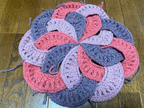 中心を縫い止めて、重なり部分も何箇所か固定しました。 次は裏側です。 ぐるぐると編んでいくだけなので、あっという間に出来上がり。 4日後、仕上げに取り掛かりました。 丸くなっている9つの山をうまく重ね合わせて、細編みを編みます。 最後はバック細編…
