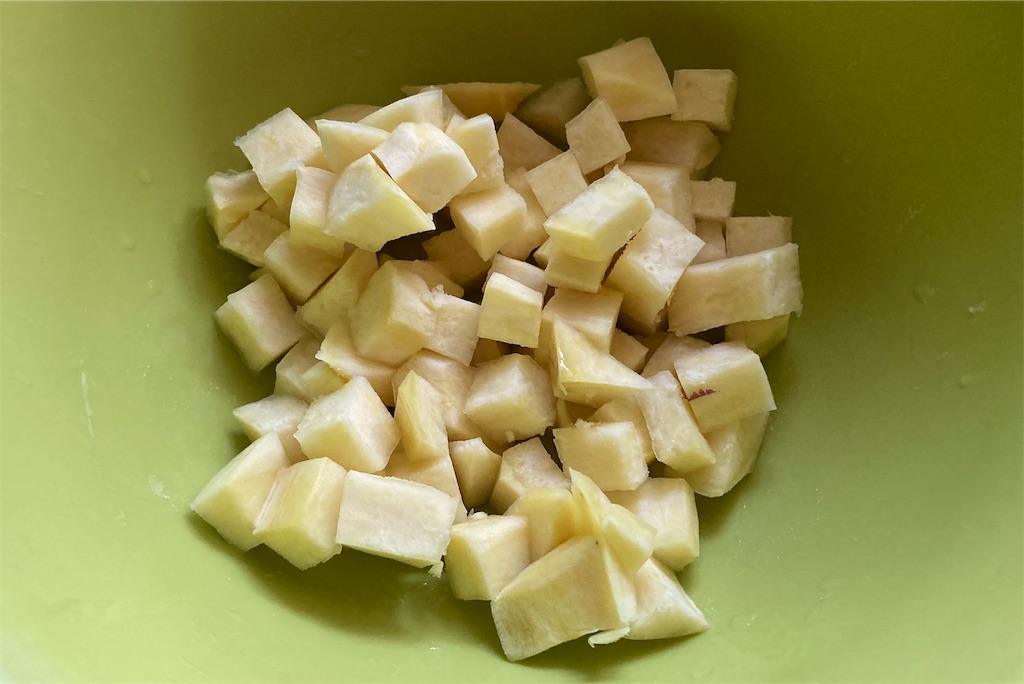 1 さつまいもは厚めに皮をむいて1㎝角に切り、水にさらす。