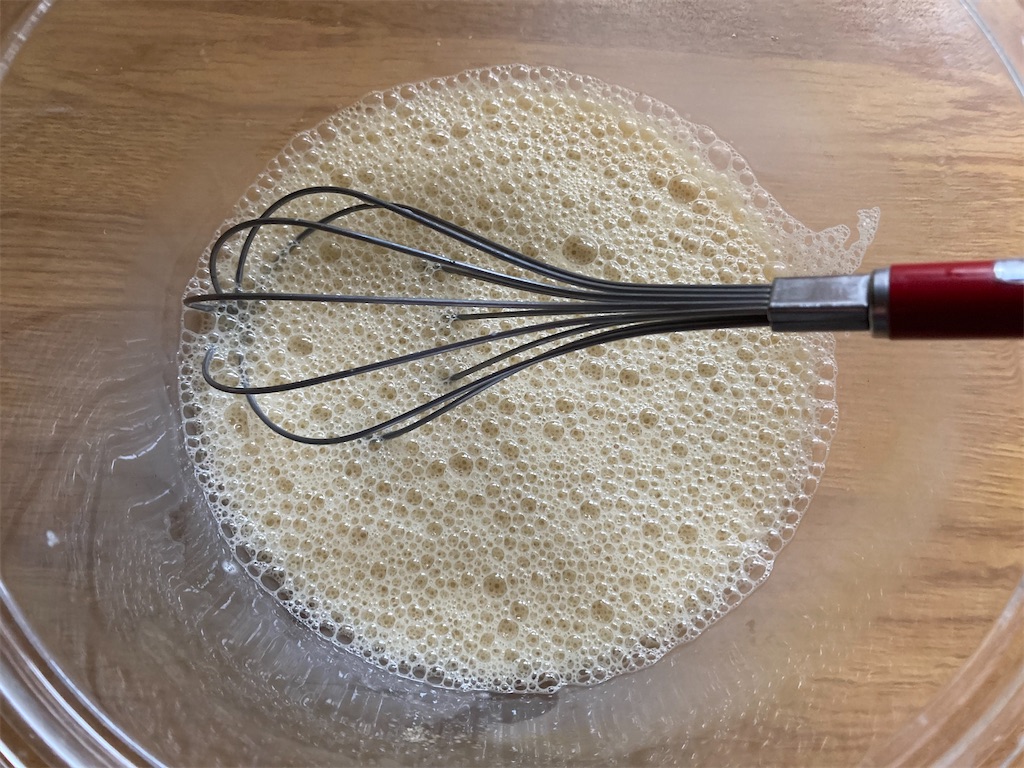 2️⃣ ボウルに卵を入れてほぐし、牛乳、きび砂糖を入れて泡立て器でよく混ぜる。
