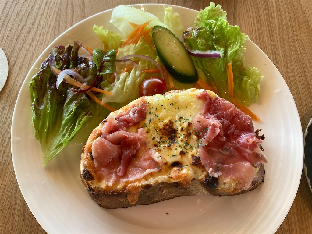 こちらのは、厚切りスライスのふわふわな石窯パンにクリーミーなベシャメルソースととろけるチーズ、生ハムをトッピングしています。